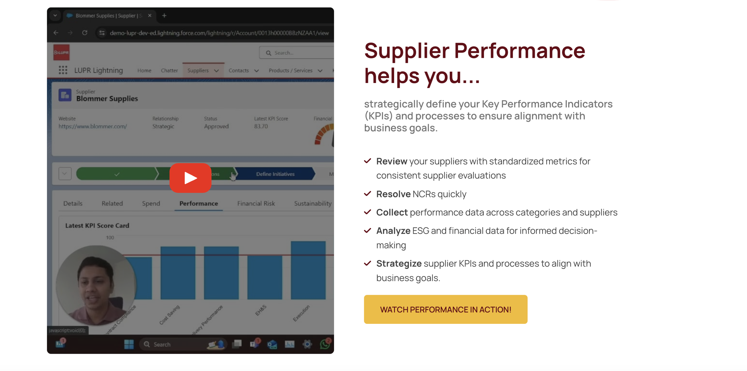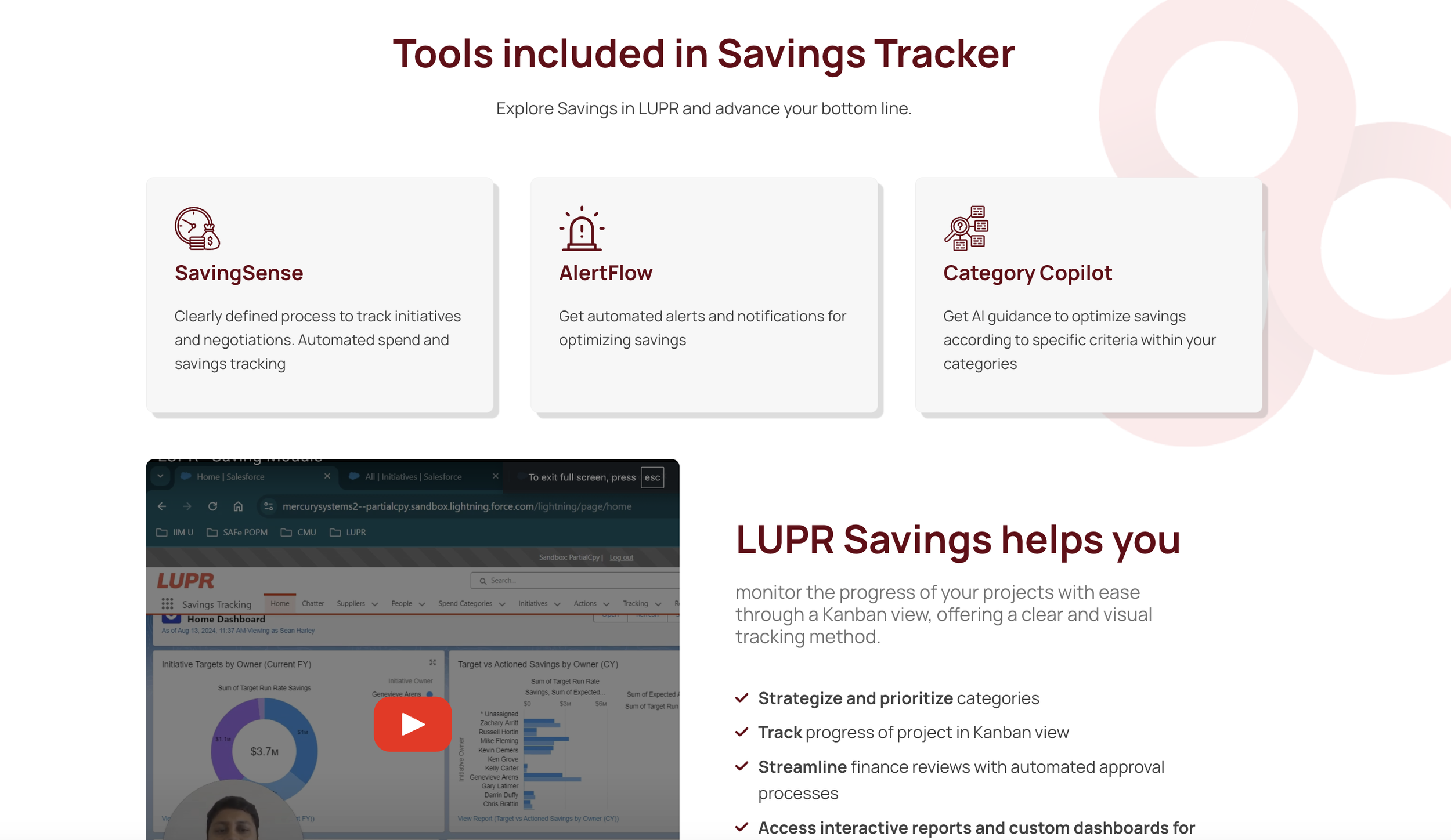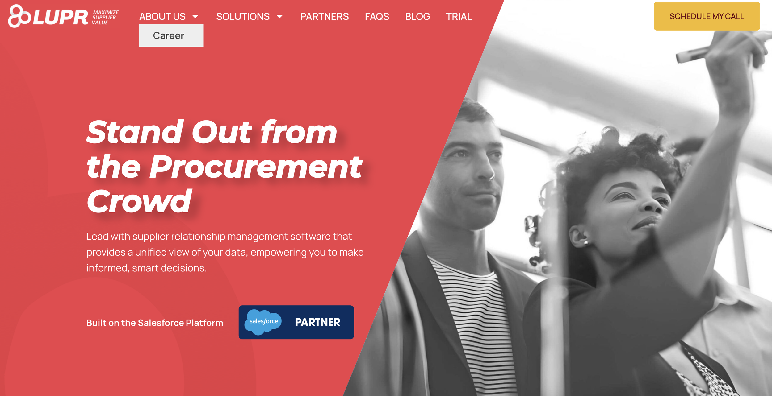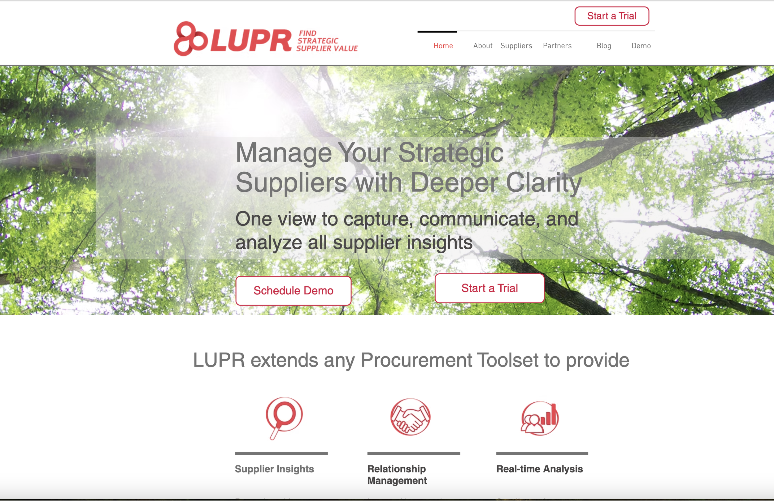 LUPR provides a real-time supplier dashboard for procurement teams, but their product story wasn’t translating into qualified demos or partner traction. We worked with leadership to refocus messaging on procurement professionals’ wins, then translated that messaging into site copy, a Solutions tab that explains each module’s value, and marketing assets that drove demos and AppExchange interest.