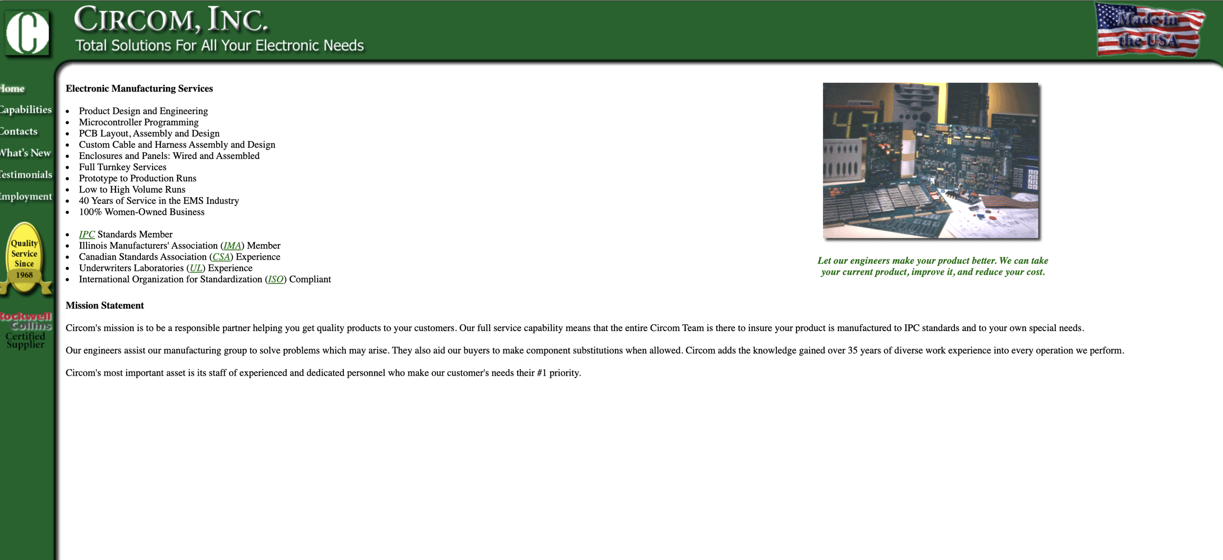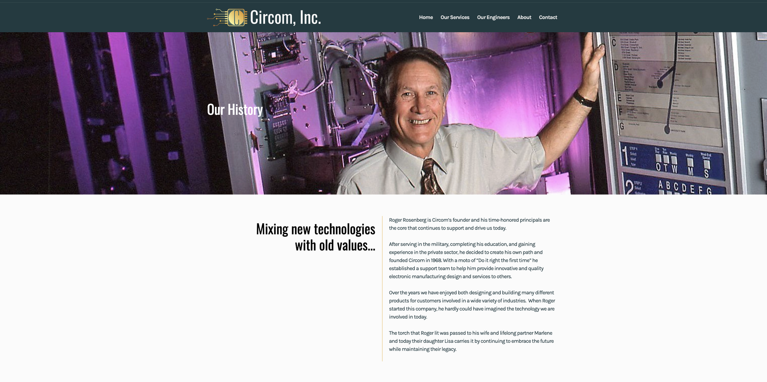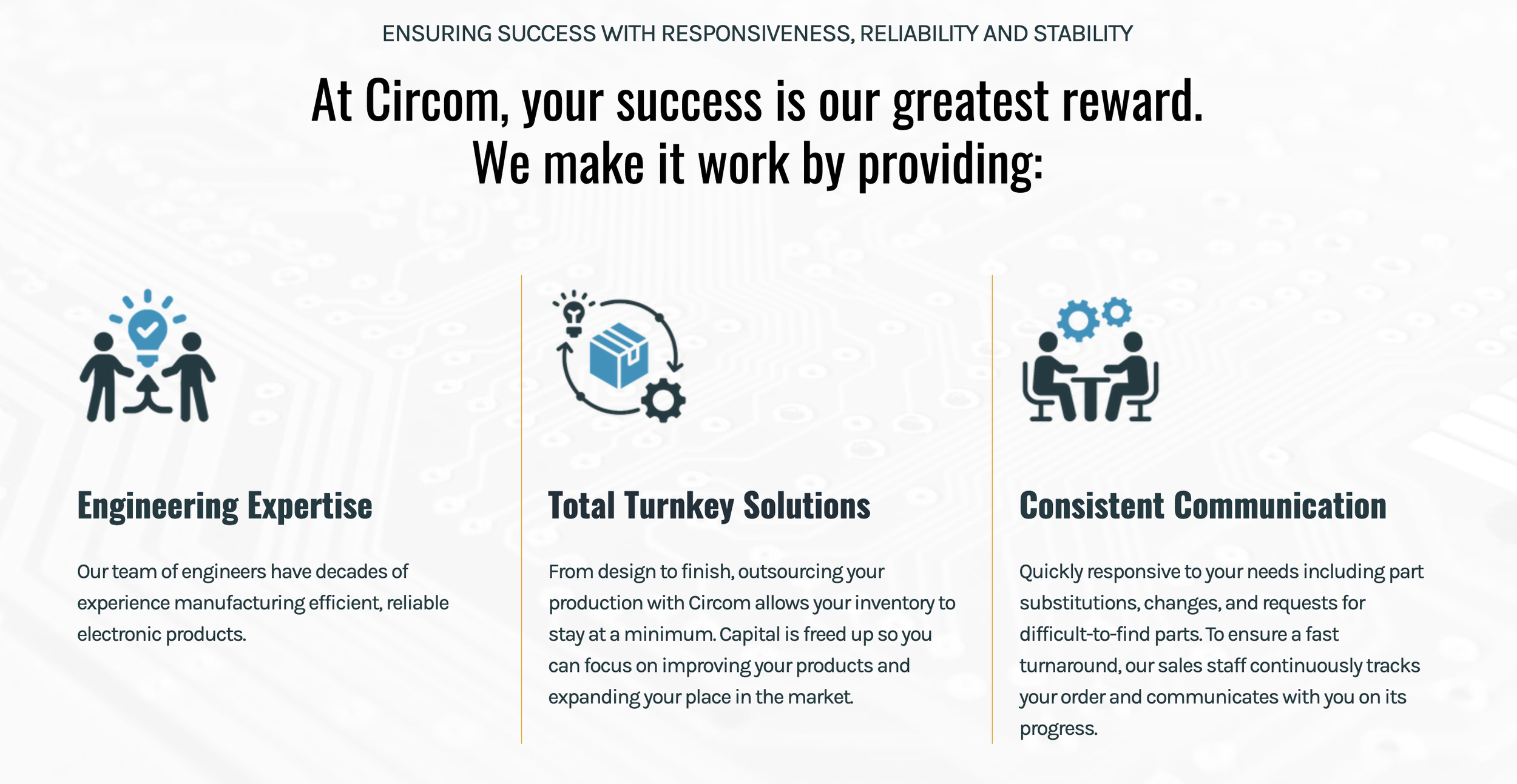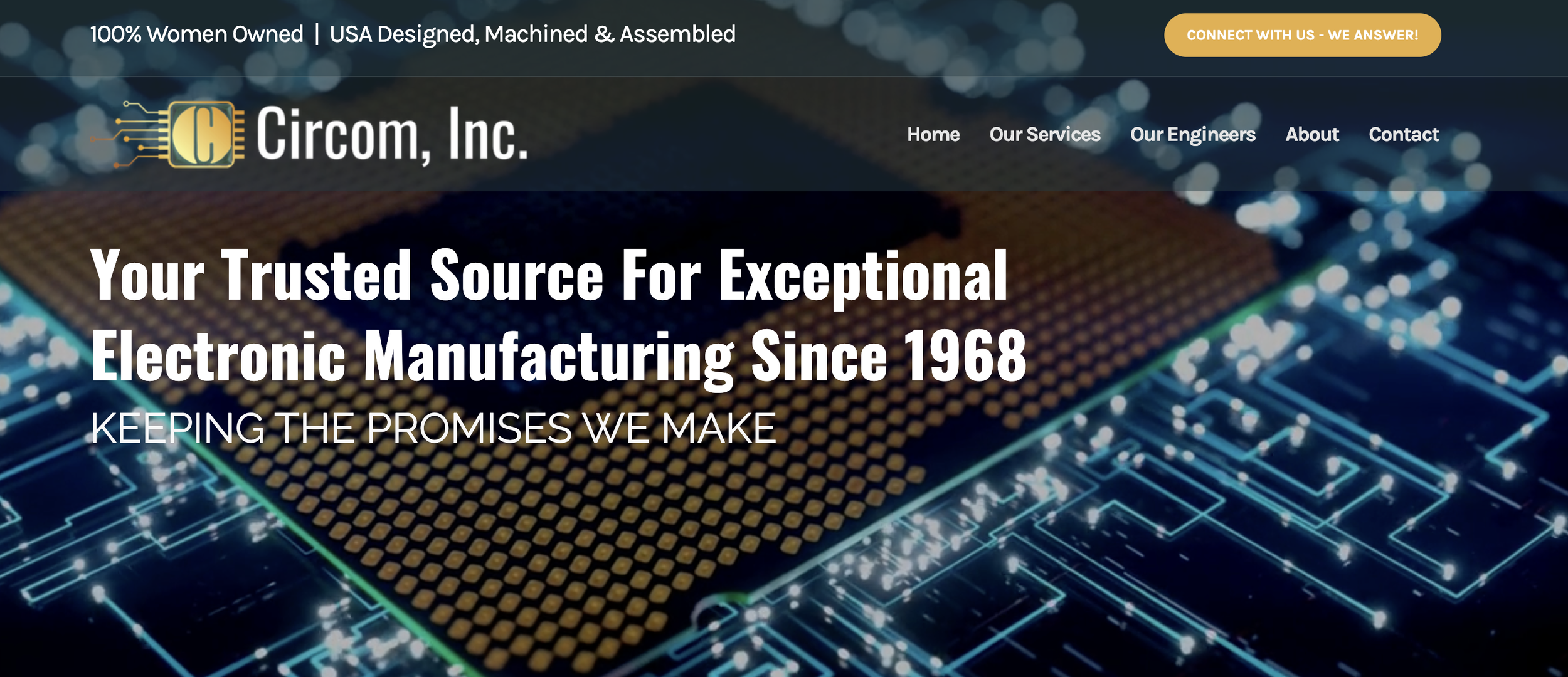 Circom Inc., a 50+ year U.S. electronics manufacturer, needed a site refresh that modernized design and clarified services while preserving the company’s legacy, woman‑owned status, and commitment to customer service. Mast & Brook focused on strategic messaging and a content‑forward wireframe that the designer used to build a trust‑forward, lead‑generating site that helps Circom stand out in a crowded, commodity-driven market.