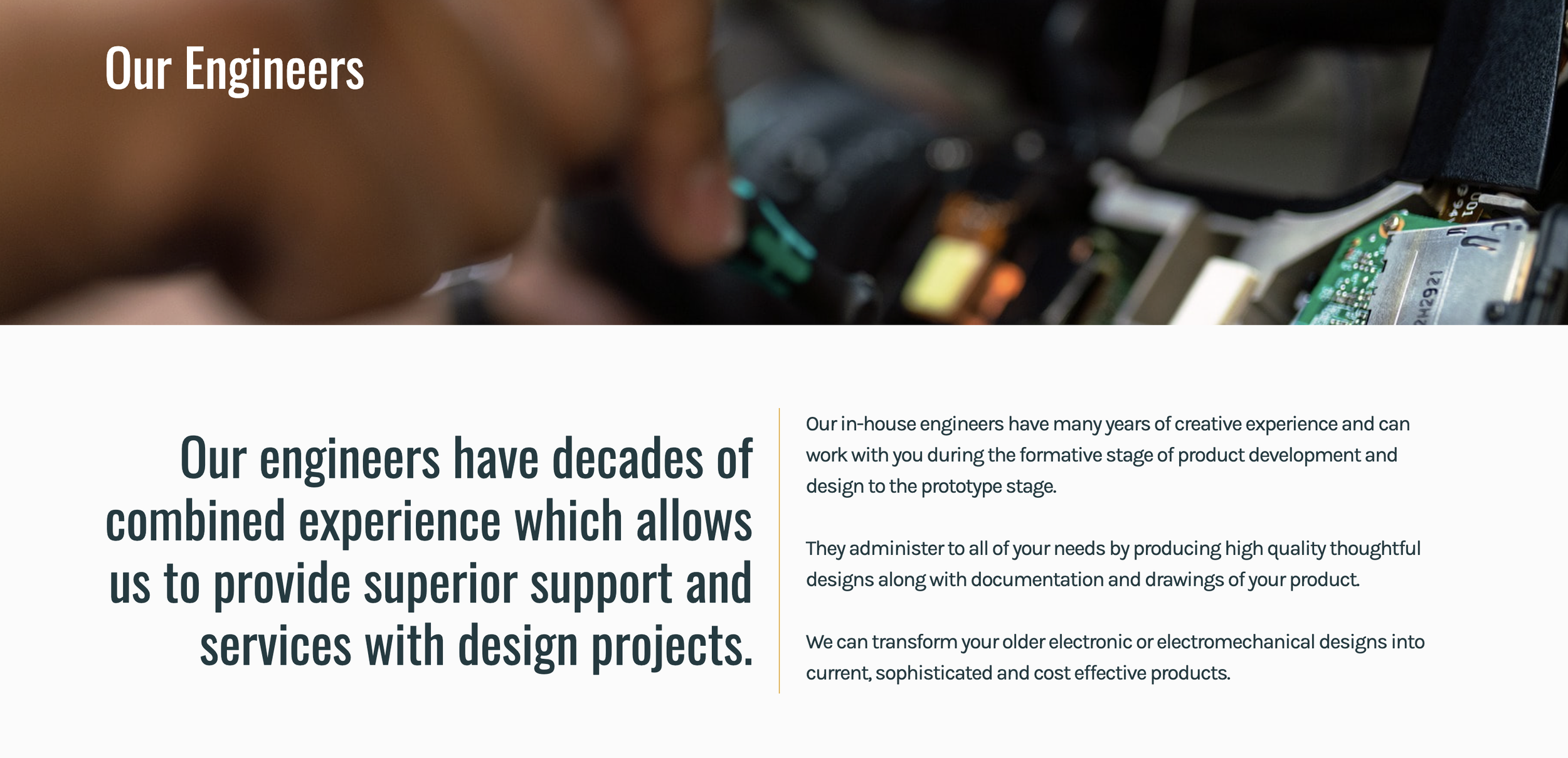 Messaging: crafted headline language, value claims (woman‑owned, USA manufacturing, founder legacy), and differentiators emphasizing senior engineering expertise and personalized service.