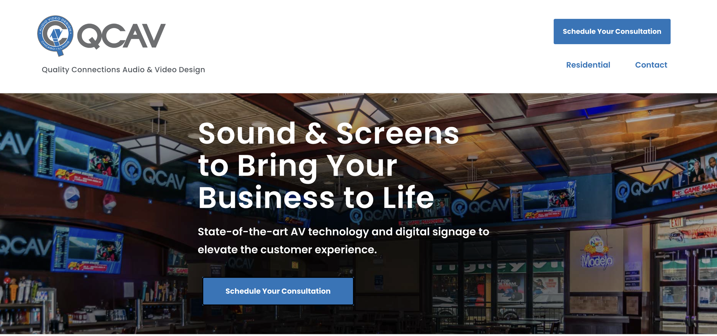 QCAV needed a commercial-first site that convinced venue owners and managers they deliver dependable sound and visuals that get customers in the door, and keep them there. Mast & Brook focused messaging and site structure on commercial buyers, added social proof, and created clear lead paths so QCAV would be taken seriously in Chicago’s competitive audio/visual scene.